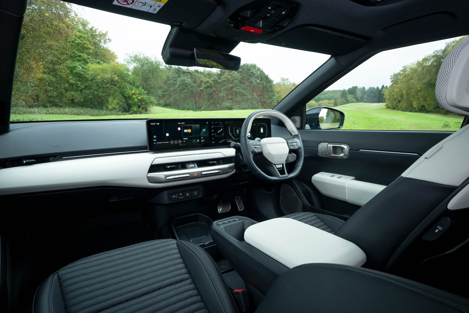 The Kia EV4 Air is available in two battery sizes:- The short range 58.3 kWh which offers a range of up to 273 miles(WLTP) and the Long Range 81.4 kWh with up to 388 mile range.Features include 17″ wheels, dual 12.3″ displays, heated front seats and heated steering wheel. Mid spec is the GT-Line 81.4 kWh with a range of up to 362 miles and features include 19″ alloys, sportier styling, two-tone faux leather, digital key and wireless charger Top of the model line-up is the GT-Line S model with the 81.4 kWh battery and a range of up to 362 miles Its Premium features include heated/ventilated seats, head-up display, Harman Kardon audio, smart tailgate, etc. This model offers the added cost-option of the Heat pump.